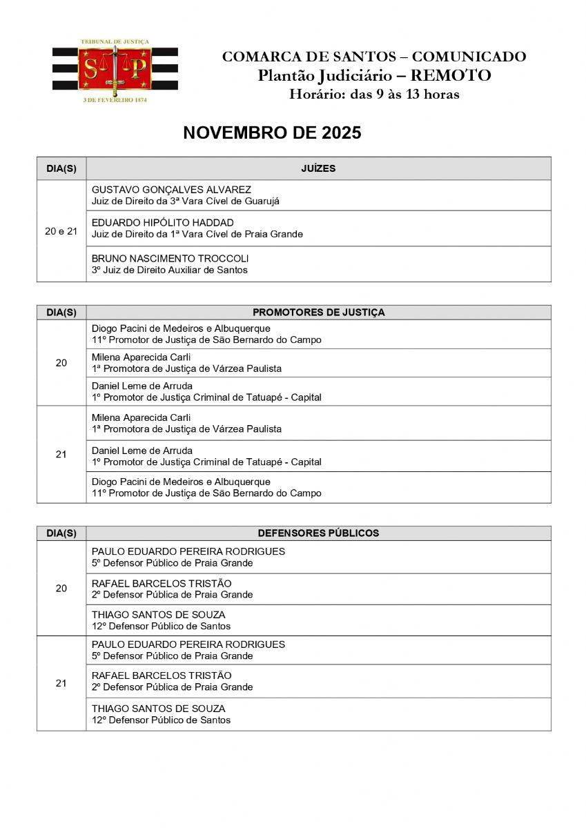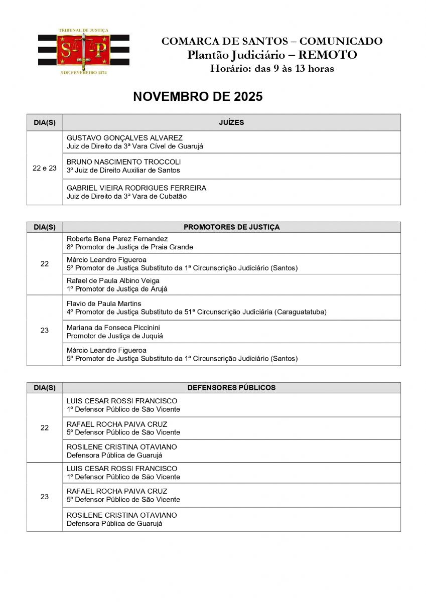 Plantão Judiciário Comarca de Santos - 20, 21, 22 e 23 de novembro
