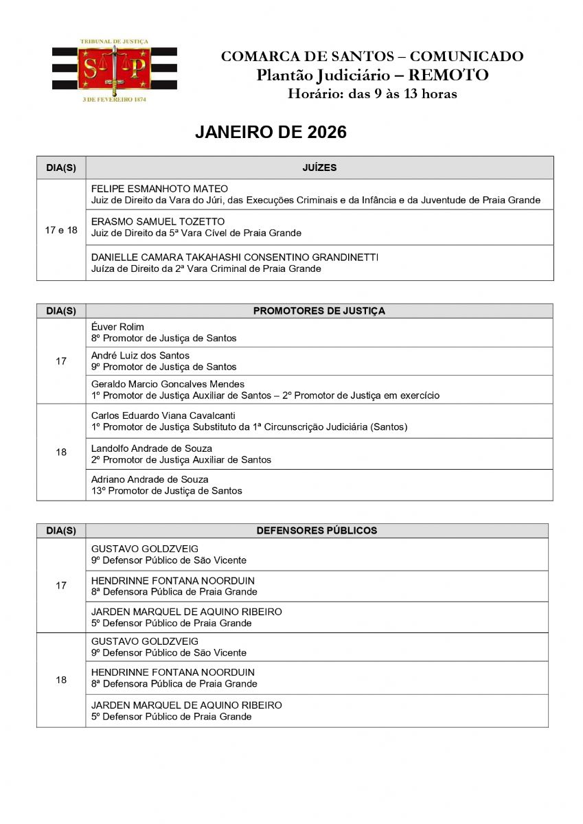Plantão Judiciário da Comarca de Santos - 17 e 18 de janeiro