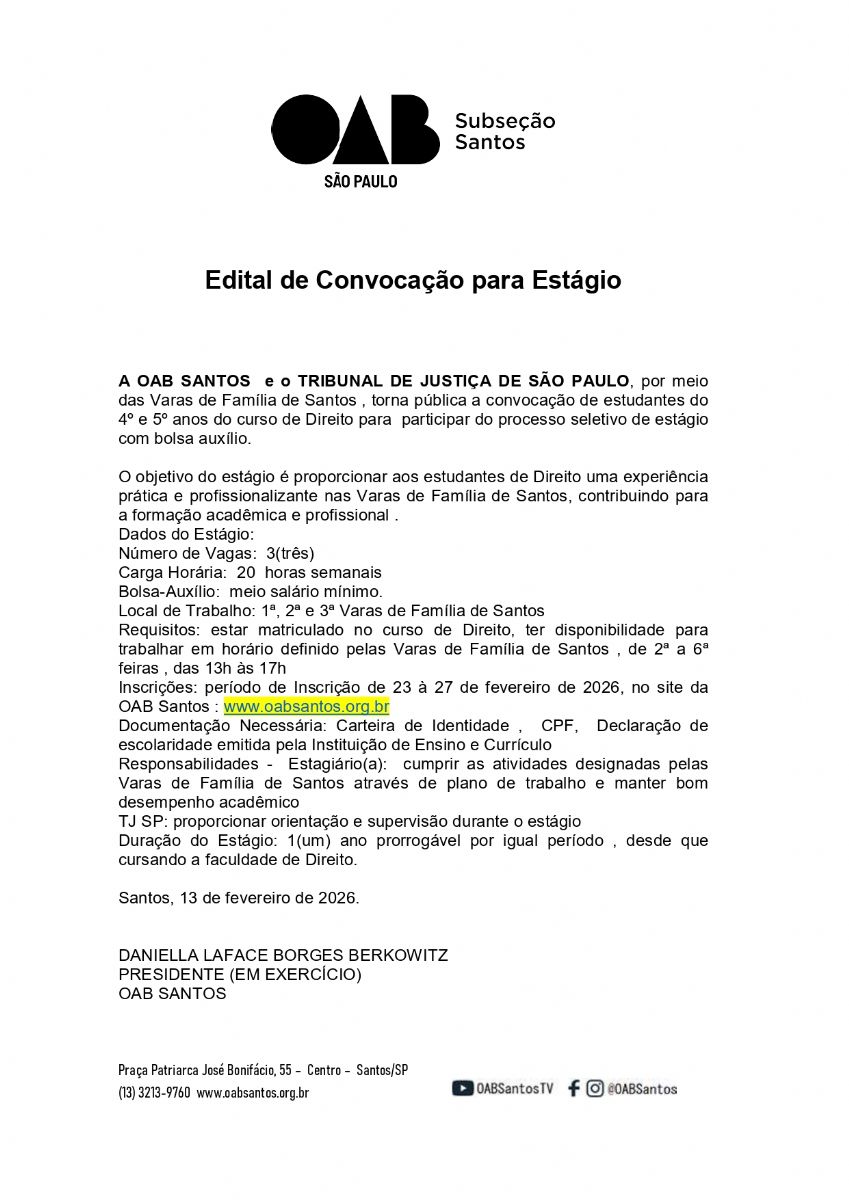OAB Santos | Edital de Convocação para Estágio