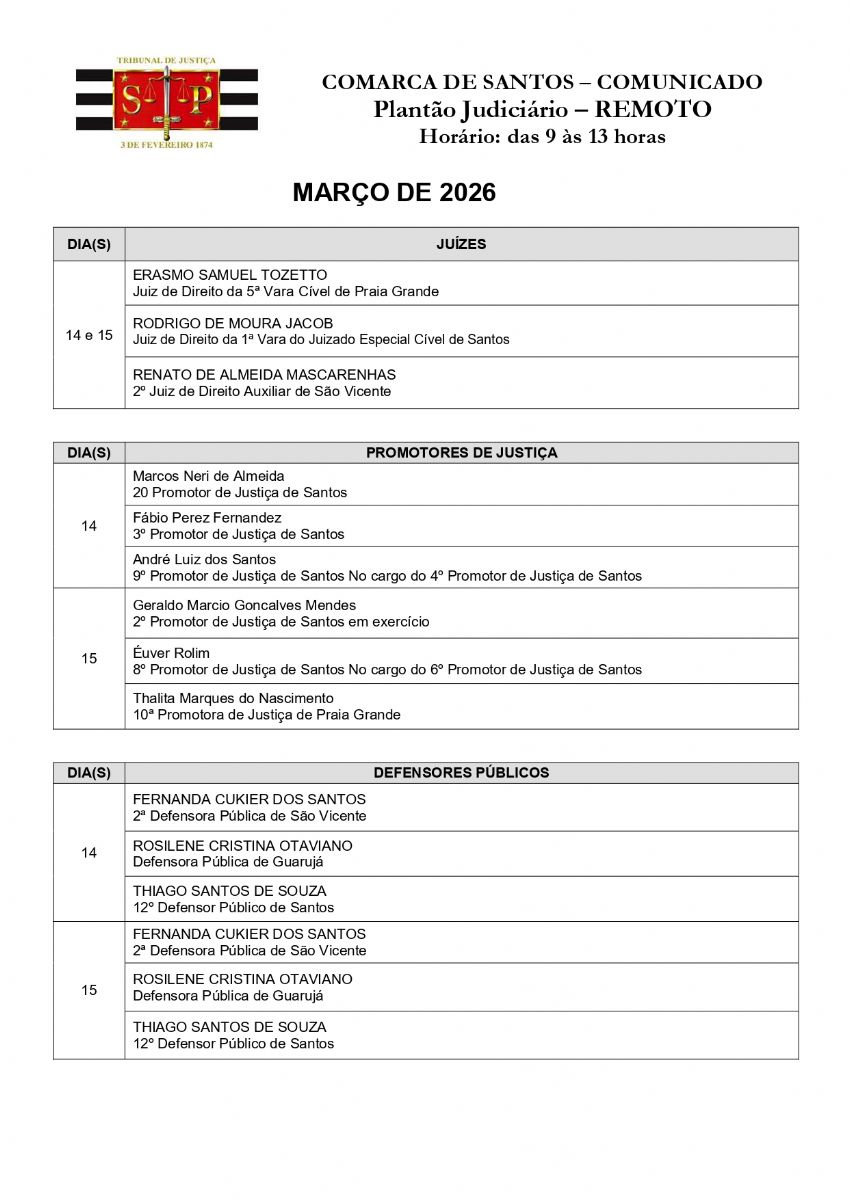 Plantão Judiciário da Comarca de Santos - 14 e 15 de março
