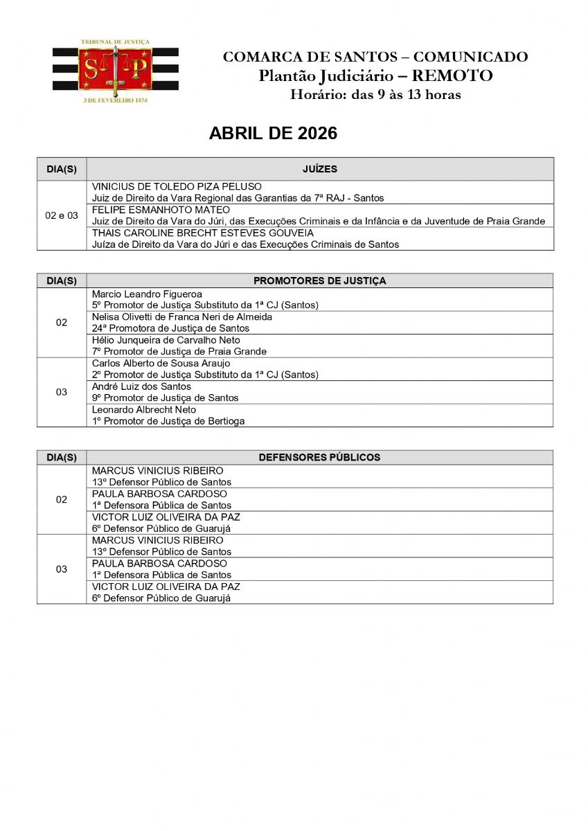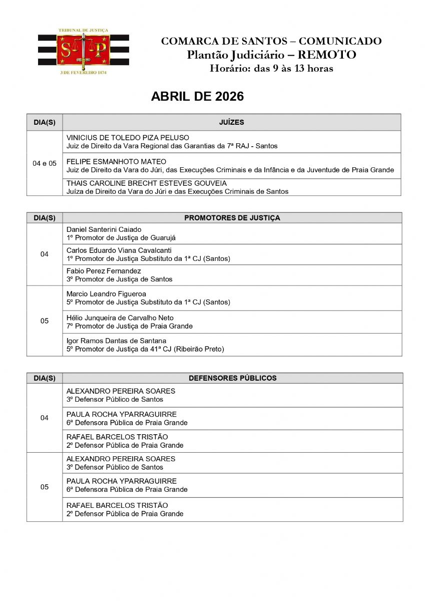 Plantão Judiciário da Comarca de Santos - 02 a 05 de abril